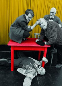 Im Verlauf der Sitzung wird es im Raum immer wärmer. Aber anstatt logische und notwendige Maßnahmen einzuleiten, um den Missstand zu beheben, entwickeln sich zum Vergnügen des Publikums aberwitzige Diskussionen und gegenseitige Schuldzuweisungen.
